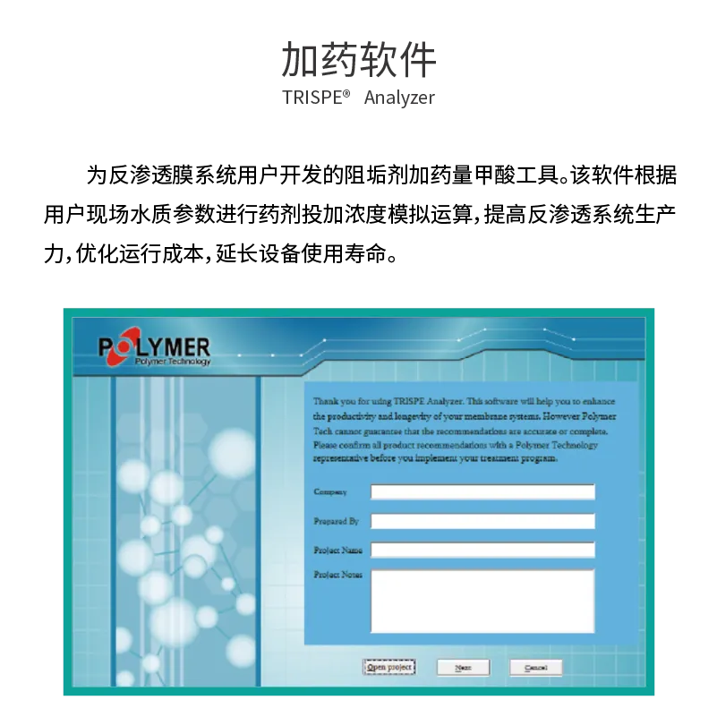加药量:根据给水水质、膜的类型和系统运作参数(如回收率、温度与压力等)来决定,一般的加药量为0.2-0.8 ppm,建议使用TRISPE Analyzer软件来计算投药量。