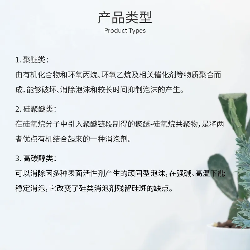 可以有效控制纸浆、泡沫漫溢和提高抄纸质量。泛应用于造纸抄造系统消泡,亦可用于造纸污水处理、防冻液、蒸馏系统消泡。