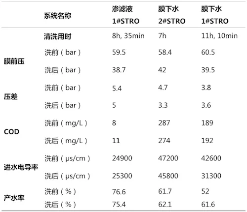 STRO处理单独膜下水水质及渗滤液超滤产水时,清洗周期均大于10天;