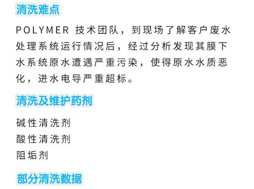 POLYMER 技术团队根据客户废水处理系统现场运行情况进行分析,发现膜下水系统原水遭遇污染,导致原水水质恶化,进水电导严重超标,为化学清洗带来很大难度。