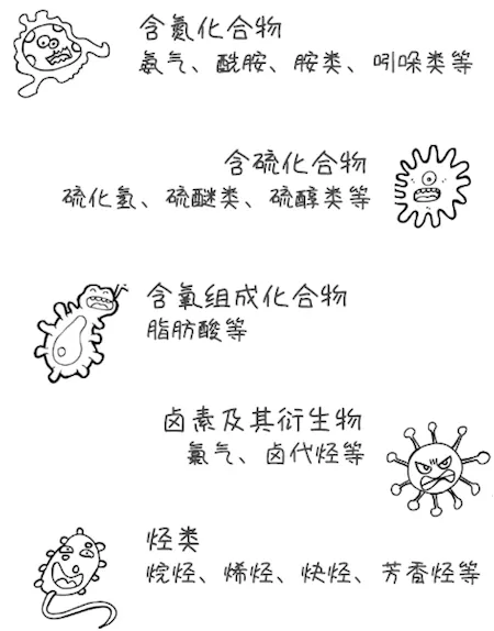 养殖场恶臭主要来源于畜禽的粪尿、污水、垫料、饲料残渣、畜禽的呼吸体、畜禽皮肤分泌物、死禽死畜等。研究者对畜禽场恶臭气体的成分进行了鉴定,发现臭味化合物有一百多种,这些恶臭物质根据其组成可分为: